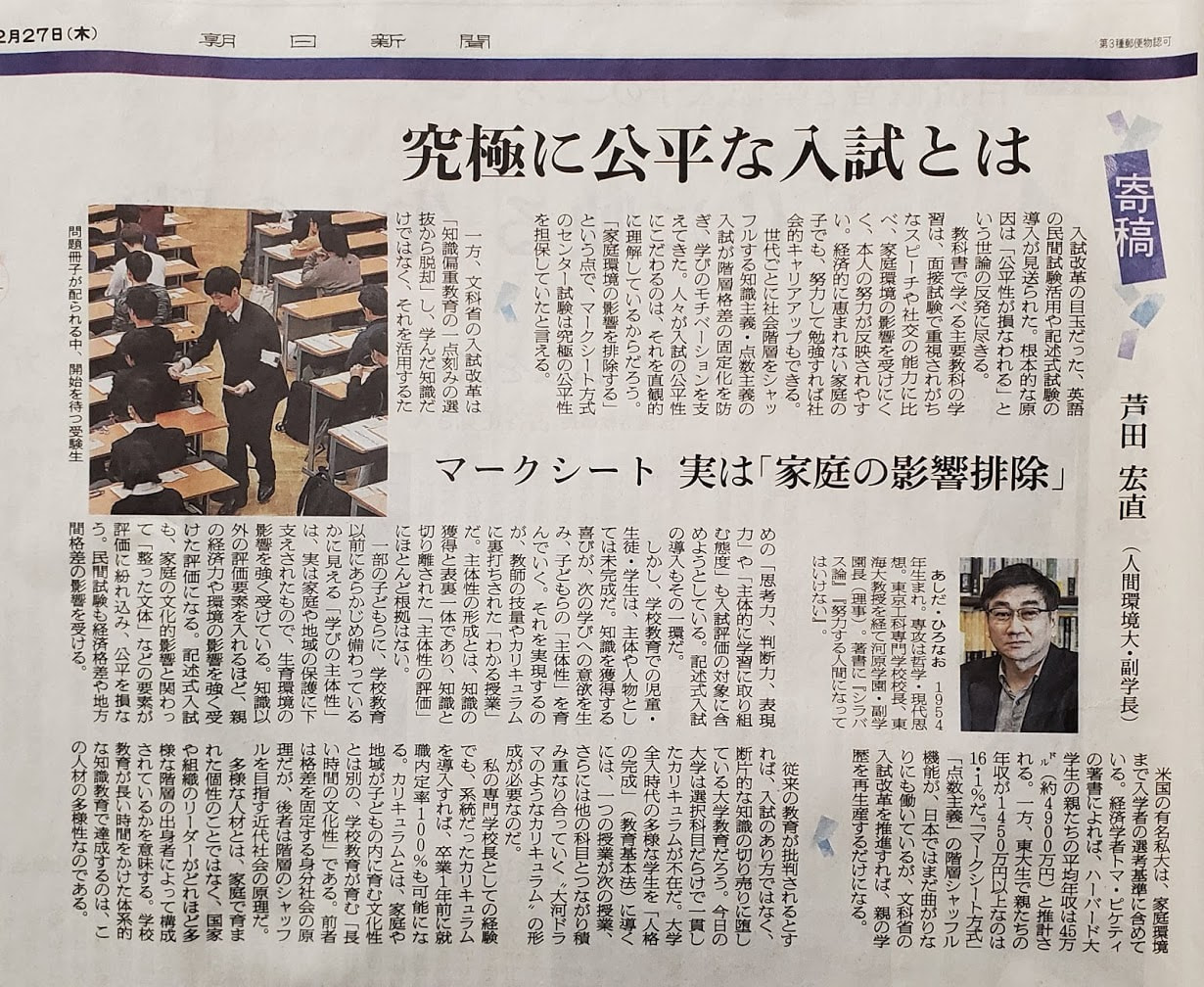 2月27日朝日新聞朝刊「文化・文芸欄」の私の記事「究極に公平な入試とは ― マークシート、実は家庭の影響の排除」の補説 2020年2月28日 14:05 教育 ,これからの大学 私の近刊『シラバス論』(晶文社)の補論(1)「大学入試改革と人物評価主義について... この記事を読む