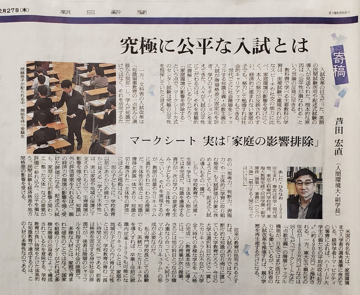 私の近刊『シラバス論』(晶文社)の補論(1)「大学入試改革と人物評価主義について」(309頁~331頁)が機縁になって朝日新聞社から依頼があり、1400文字という厳しい文字制限の中でなんとかまとめた入試改革議論が2月17日朝刊の「文化・文芸欄」に掲載されました(以下挿入画像参照のこと)。1400字に簡略する前の段階の原稿(この原稿は1900文字あり、それを1400字に再度書き直したものが朝日の記事です)を掲載しておきます。少しはこの詳細版の方がわかりやすいかと。もっと詳しいバージョンは、『シラバス論 ― 大学の時代と時間、あるいは〈知識〉の死と再生について』(晶文社刊)の当該個所とシラバス論本論をお読み下さい。シラバスの問題と入試改革の問題は、同じ問題の裏表の関係になります。それが私のここ数年来の主張です。