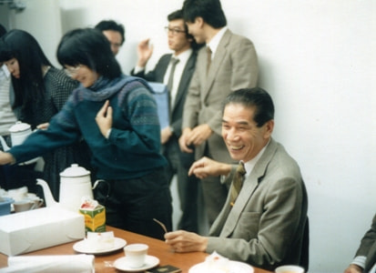 これはジャック・デリダが日本に初来日、早稲田大学の文学部キャンパスでのレクチャーのあとのデリダとの懇親会(1983年10月26日)での川原先生。一番川原先生らしい笑顔だ。