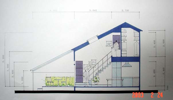 >  4)階段をオープン型にしたため(また中庭を作ってスペース設計の自由度が下がった分)、2階の寝室からはもっとも遠い位置に階段を作ってしまった。せっかくのエレベータからも遠い。これは62歳の婦人の一人暮らしには向かないかもしれない。