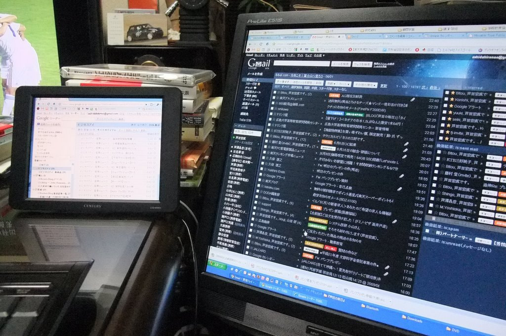 私の場合、通常はGoogleリーダー(RSSリーダー)をこのディスプレイに表示している。『芦田の毎日』の「今日のニュース」(http://www.google.com/reader/shared/07345837526963288969)の供給元のデータだ。私の場合、Googleリーダーに登録しているサイトが60個以上あるため、ちょっと気を抜くと未読記事が1000を超えてしまう。たまったものではない。だから記事が送られてくる度に目を通せる状態が欲しい。そうすれば溜まる前にゆっくり読める。