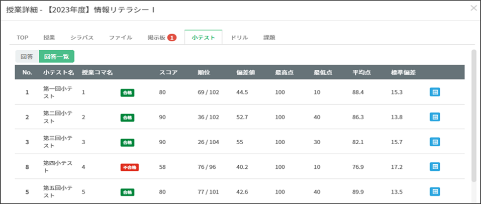 小テストは、LMS上(=パソコン上か、スマートフォン上)で、授業終了時行われ、回毎の受講人数中の順位、偏差値、最高点数と最低点数、平均点、標準偏差のすべてが瞬時に学生の手許でわかるようになっています(図参照のこと)。学生は回を重ねる度にそれらの履歴を通覧し、期末試験に向かっての学習の仕方を、「テストワーク」と共に色々な仕方で軌道修正することができます。