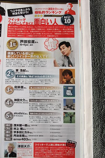昨日の22日に発売された学研『GetNavi』2010年大ランキングBEST10特集、Twitter部門で、なぜか私が(笑)、あの宇多田ヒカルの8位を抑えて、第一位に輝きました。選者は、『Twitter社会論』の著者:津田大介さんです。